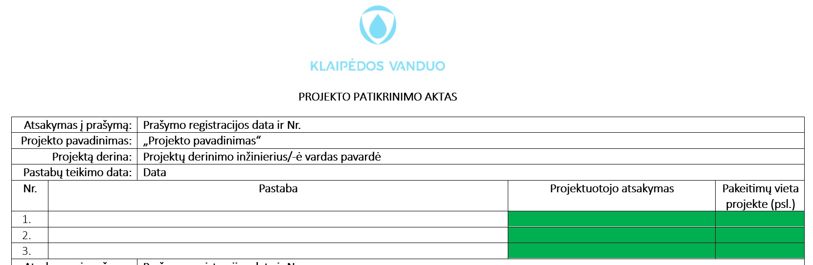 Projektuotojas, teikdamas pakartotiniam derinimui projektą, prie prašymo turi kartu su projektu pateikti užpildytą projekto patikros aktą (*doc. Formatu), kurį gavo iš projekto derinimo inžinieriaus.