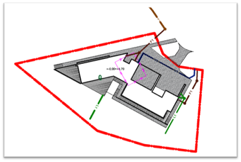 - Sklypo planas su projektuojamais inžineriniais tinklais, pažymėtais charakteringomis koordinatėmis ir nurodytomis tinklų susikirtimų vietomis bei atstumais iki Bendrovei nuosavybės teise priklausančių ar eksploatuojamų vandentiekio ir nuotekų tinklų.