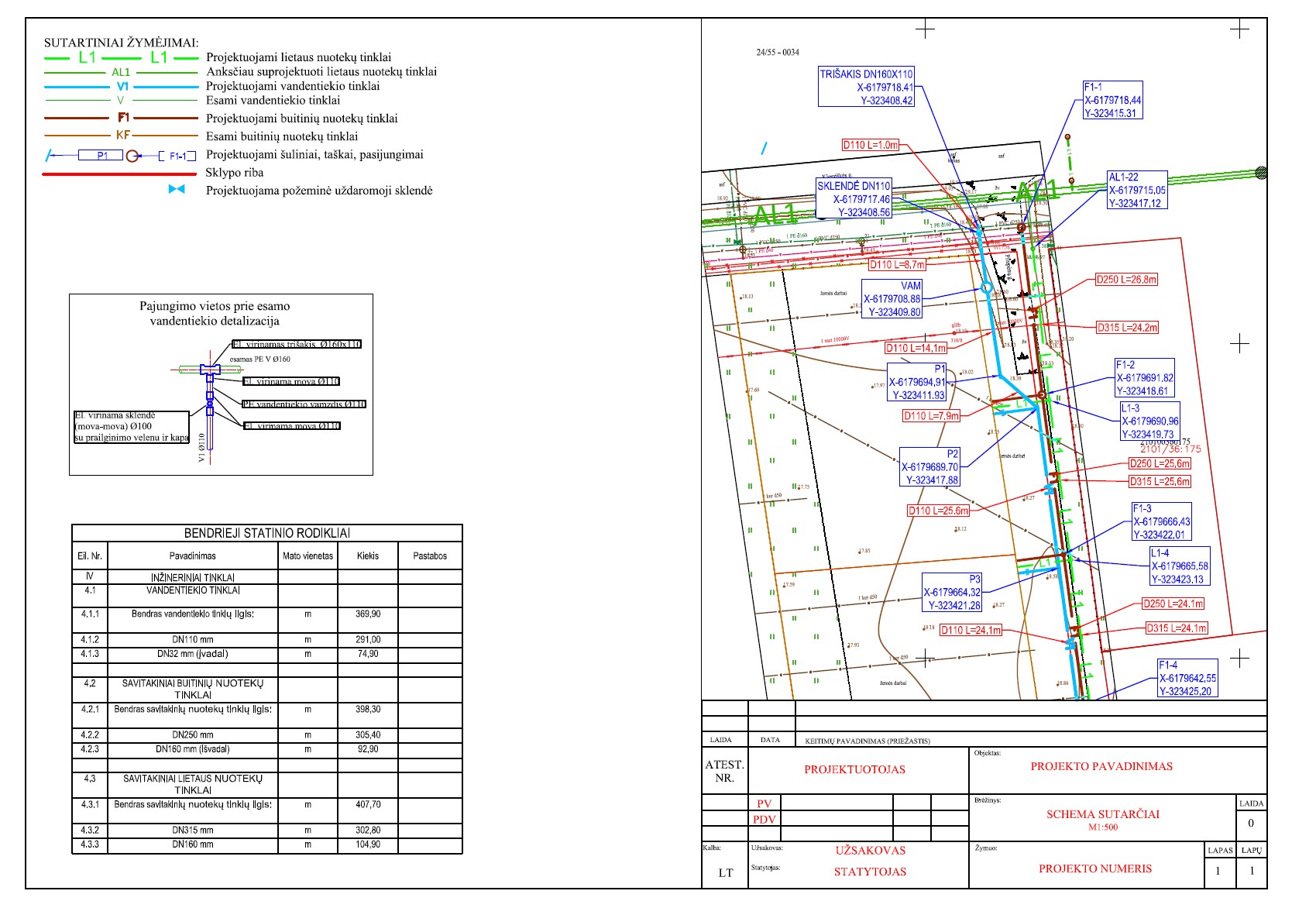 - Projekto planiniuose sprendiniuose (.dwg faile) turi būti pateiktos projektuojamų tinklų ašinės linijos, šuliniai/kameros/požeminės sklendės ir kiti tinklo elementai, žemės sklypų ribos, pastatų kontūrai. Brėžinys privalo būti koordinuotas.