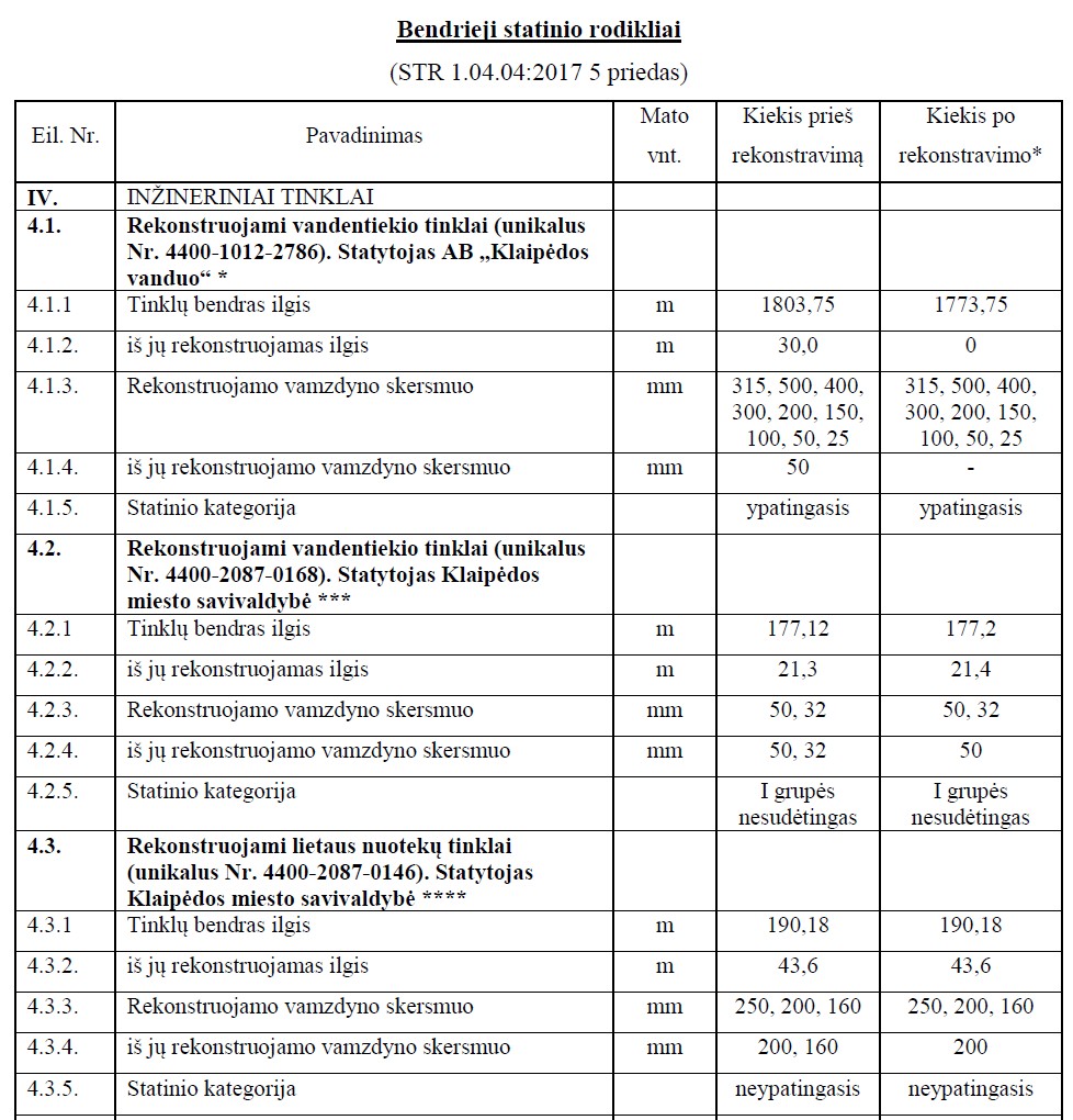 2) Bendruosiuose statinio rodikliuose turi būti nurodytas rekonstruojamas tinklas su jo unikaliu numeriu, pastabose nurodant, kokie konkrečiai darbai bus atliekami ir koks turtas tvarkomas AB „Klaipėdos vanduo“ (rekonstrukcijos ir remonto atveju). Bendrieji rodikliai tikrinami projekto lauko vandentiekio ir buitinių nuotekų dalies derinimo metu, arba IS „Infostatyboje“, kai lauko vandentiekio ir buitinių nuotekų dalis yra viena iš projekto sudedamųjų dalių ir bendrieji rodikliai nurodyti projekto bendrojoje dalyje.